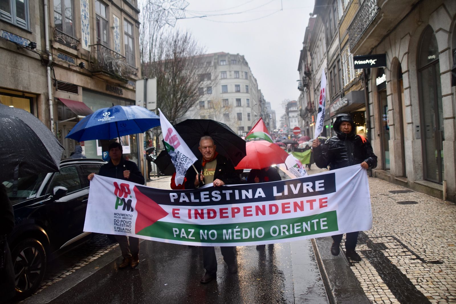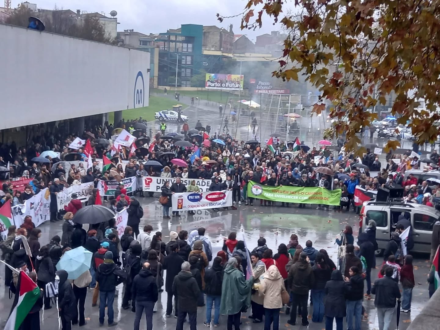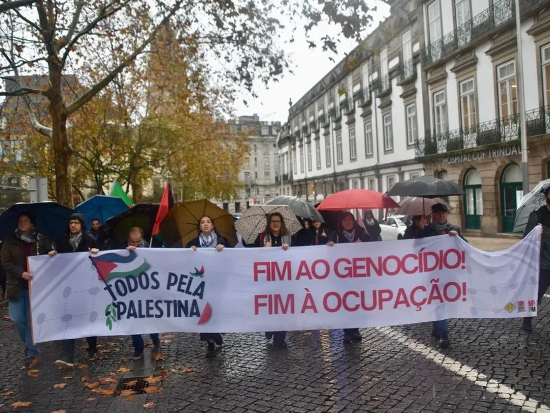 A muita chuva que caiu na tarde do sábado, dia 29 de Novembro, não demoveu várias centenas de pessoas de se manifestarem nas ruas do Porto, em solidariedade com a Palestina, exigindo o fim do genocídio e da destruição de edifícios, bem como o cessar-fogo efectivo e a ajuda humanitária sem entraves na faixa de Gaza, a par do termo da ocupação ilegal de terra palestina por parte de Israel, e da acção violenta, também ela completamente ilegal, e condenada internacionalmente, levada a cabo por colonos e milícias israelitas na Cisjordânia.