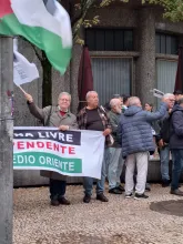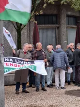 “Paz no Médio Oriente, Palestina independente!”, “Israel é culpado por um povo massacrado!”, “Paz sim, guerra não!” e “Palestina vencerá!” foram apenas quatro das palavras de ordem escutadas nesta concentração que teve lugar na Praceta da Palestina, no Porto (esquina da Rua de Sá da Bandeira com a Rua de Fernandes Tomás), marcada pelo tom combativo e solidário, não obstante as condições atmosféricas pouco favoráveis.