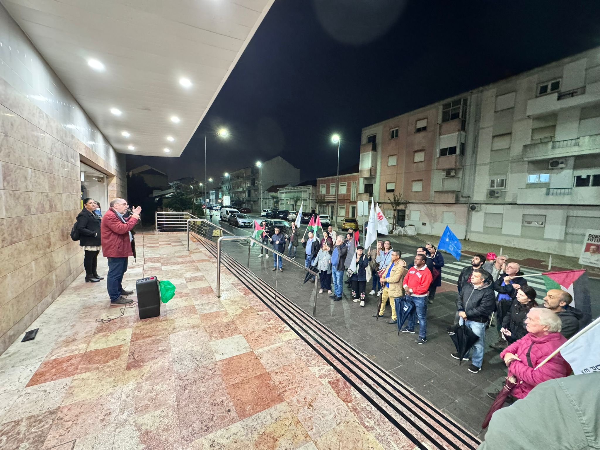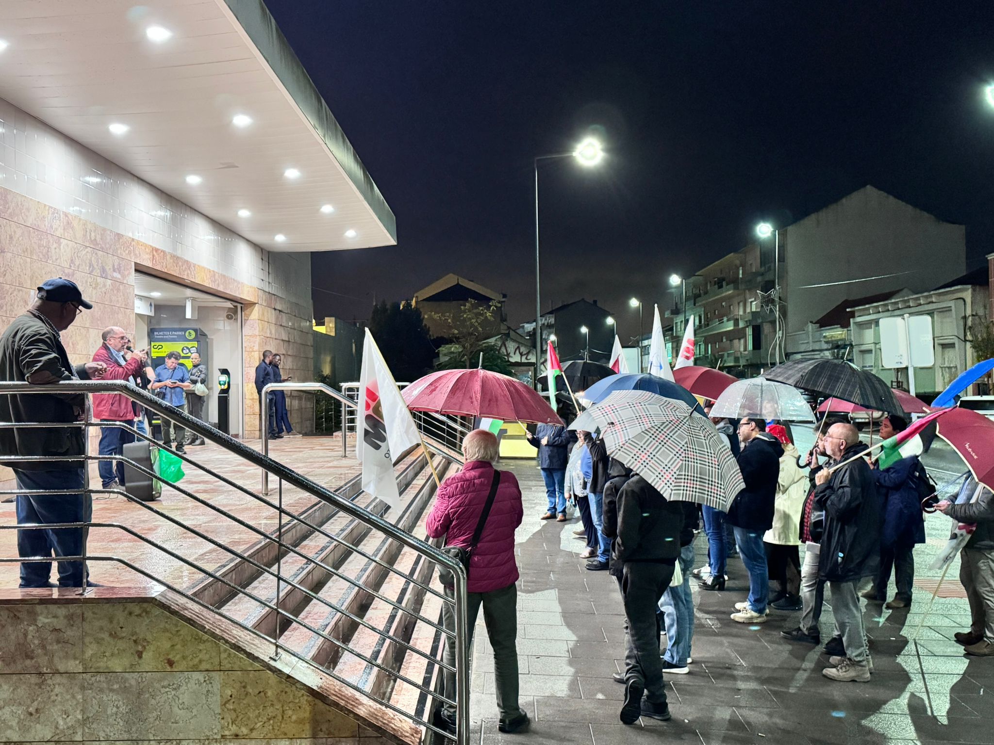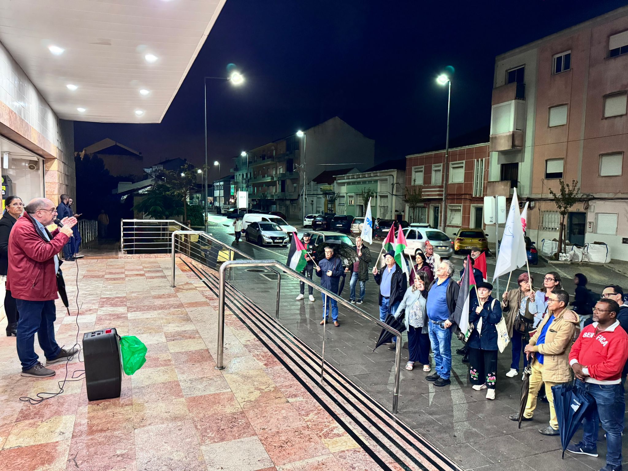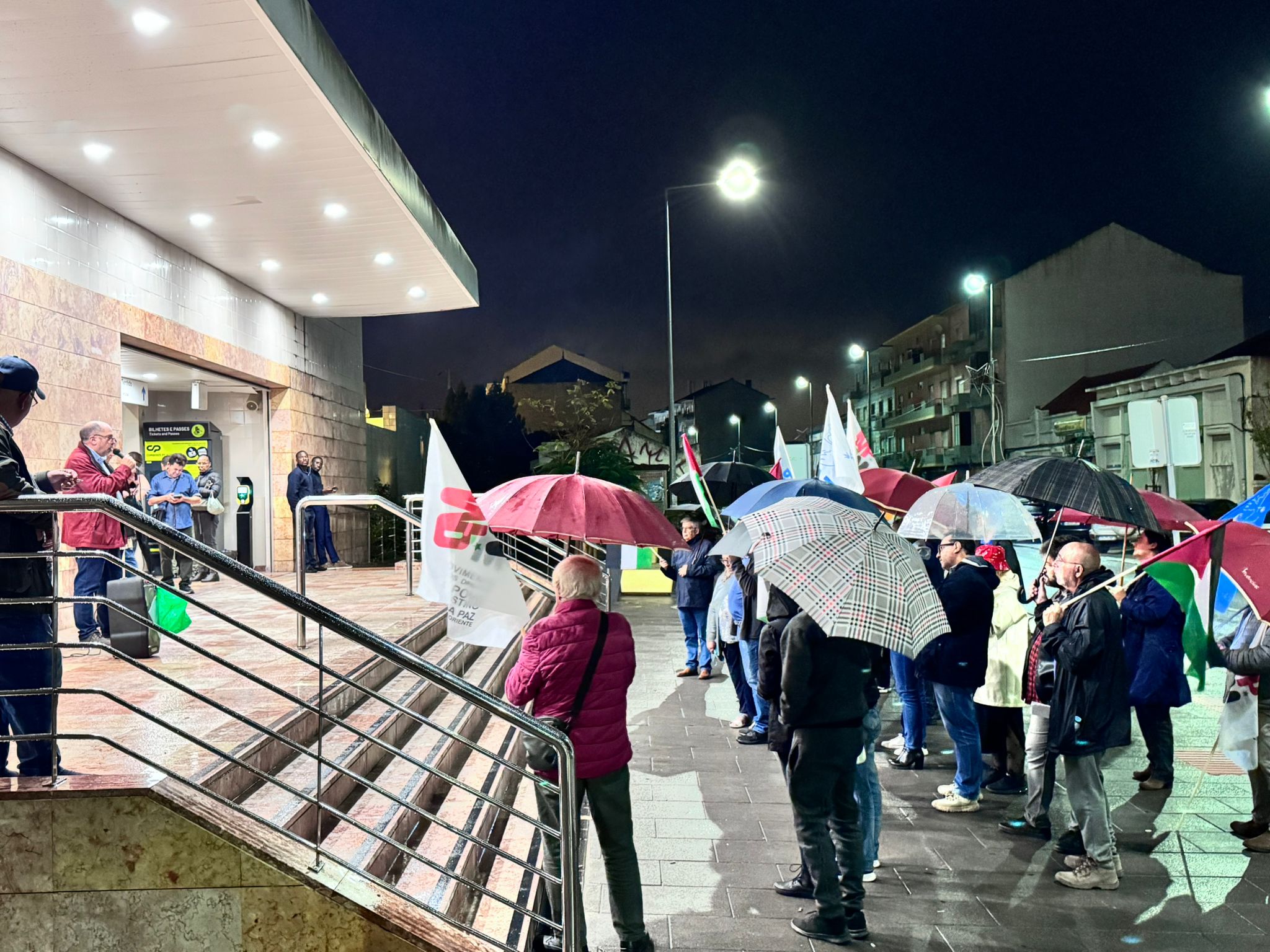 O mau tempo não impediu dezenas de pessoas de se reunir na Baixa da Banheira, junto à estação da CP, na sexta-feira, 31 de Outubro, para manifestar a sua solidariedade com o povo palestino e reclamar o fim do genocídio em Gaza.