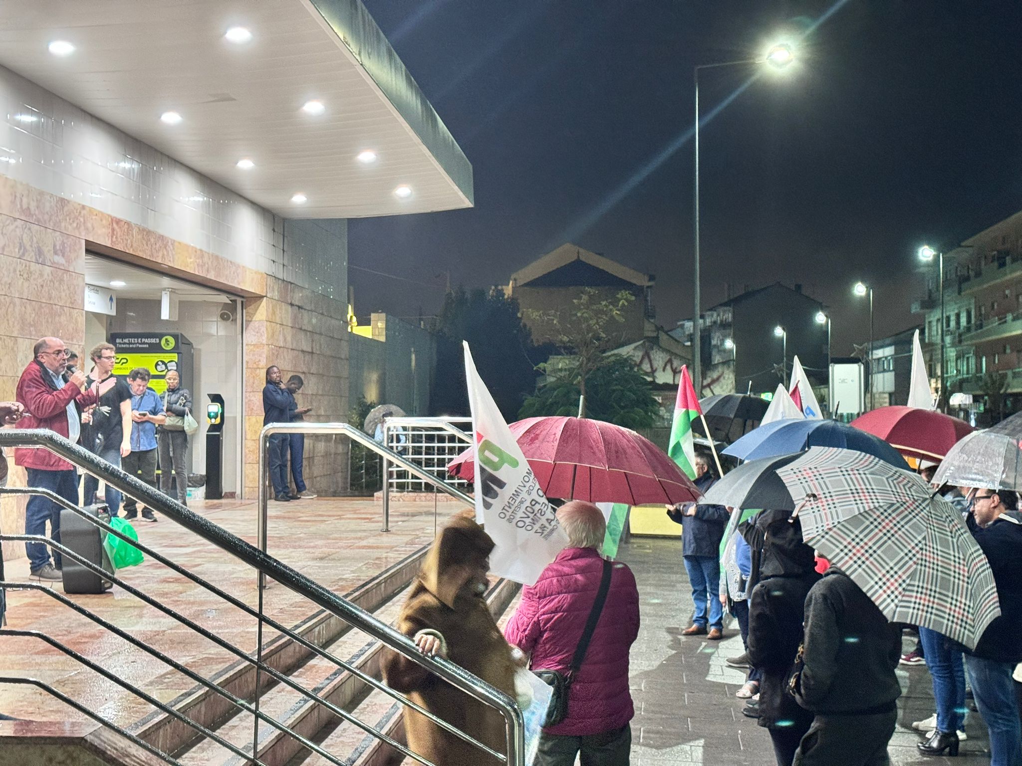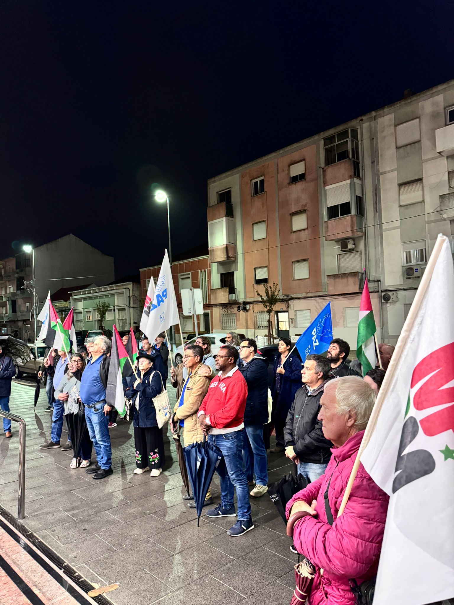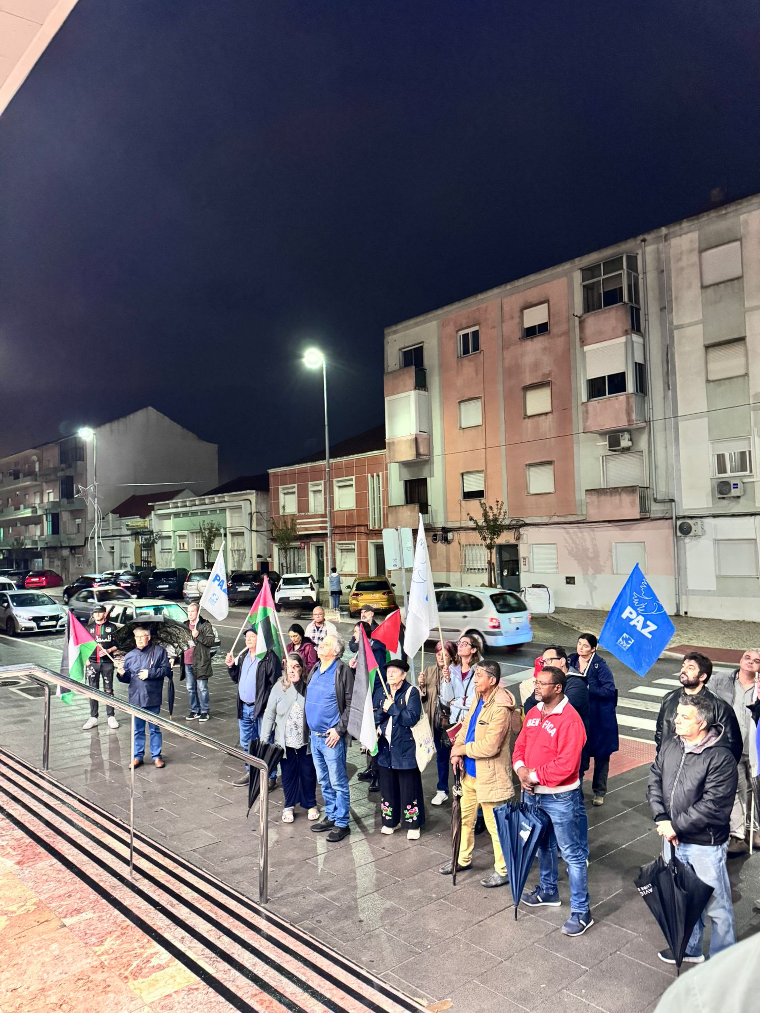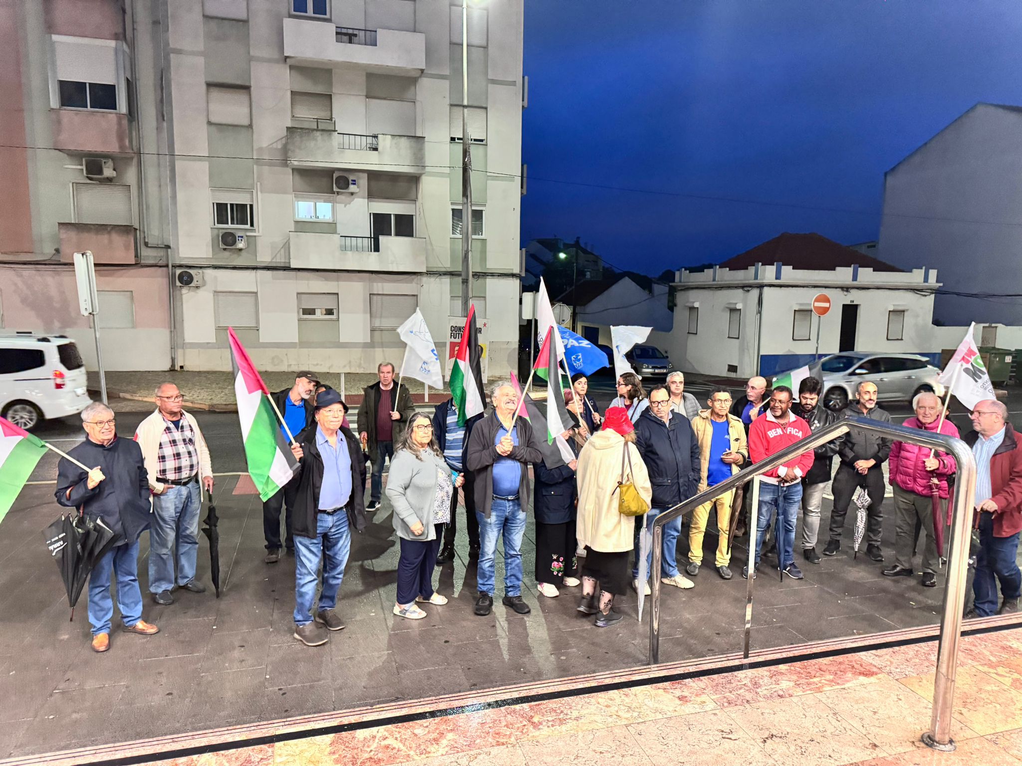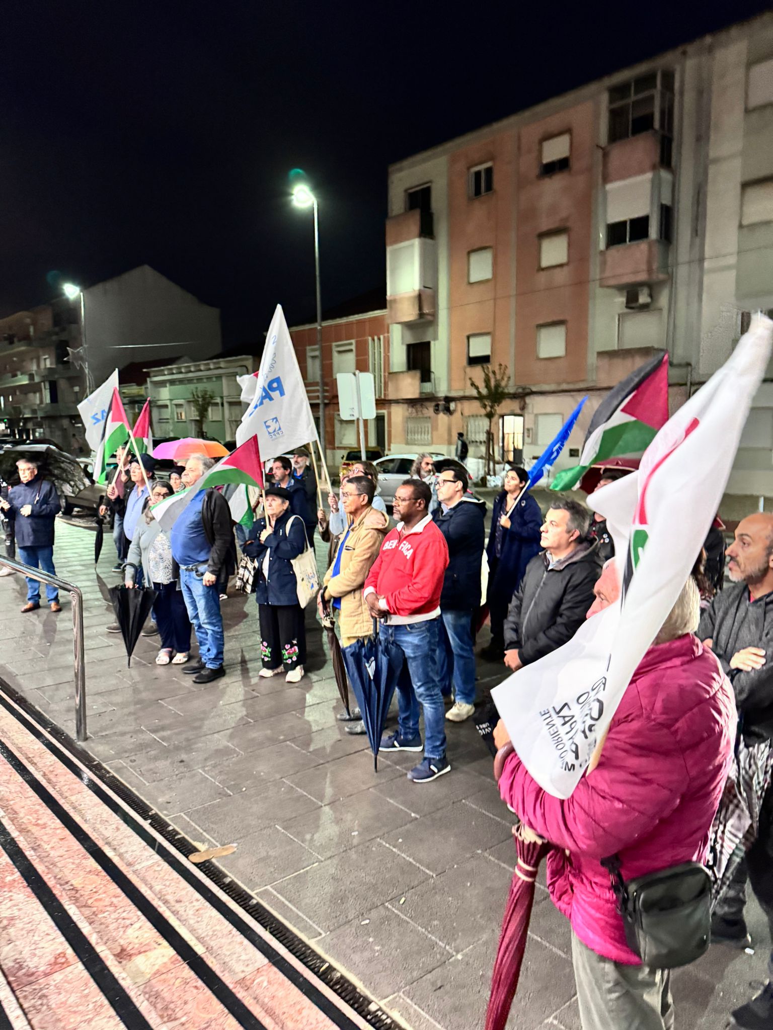 O mau tempo não impediu dezenas de pessoas de se reunir na Baixa da Banheira, junto à estação da CP, na sexta-feira, 31 de Outubro, para manifestar a sua solidariedade com o povo palestino e reclamar o fim do genocídio em Gaza.