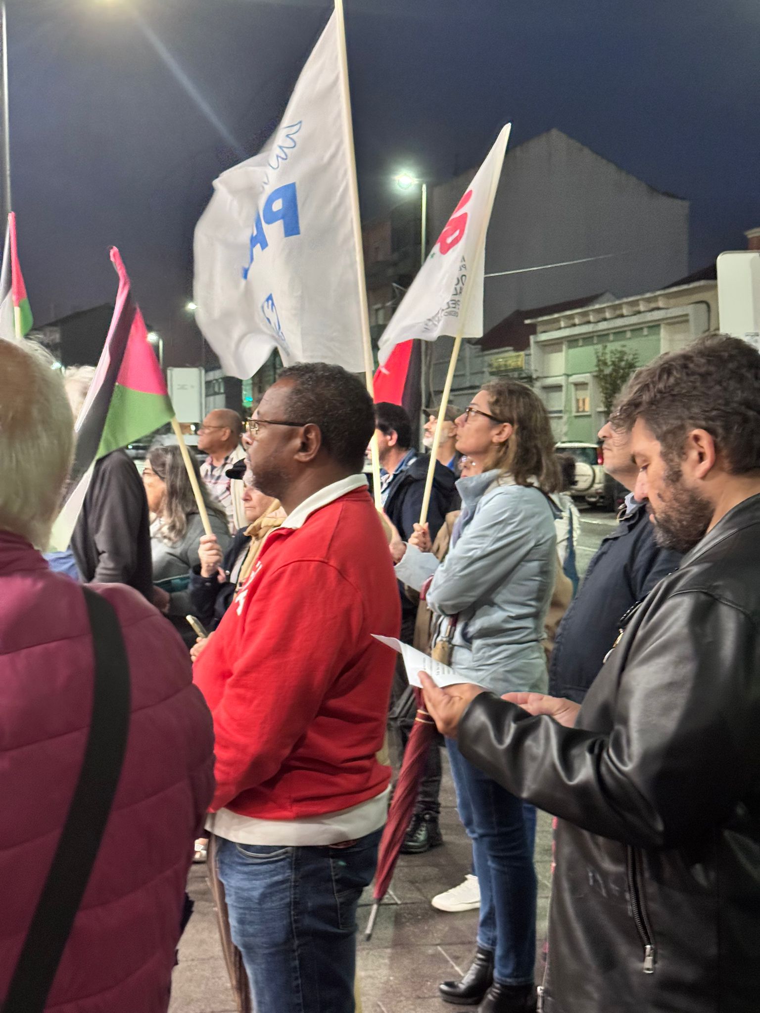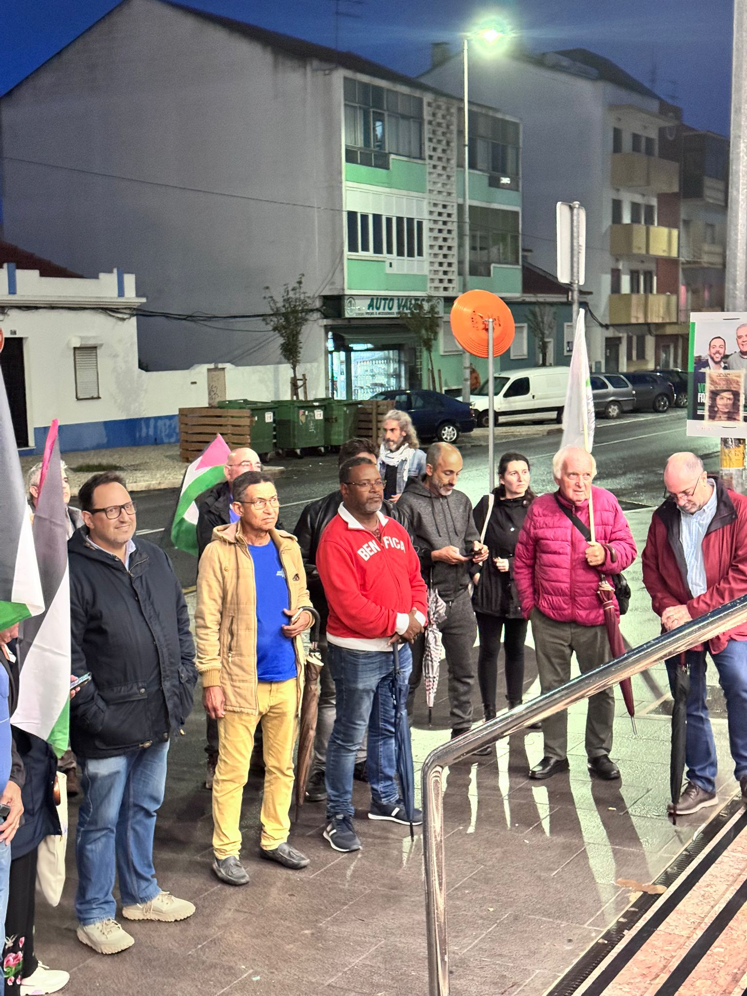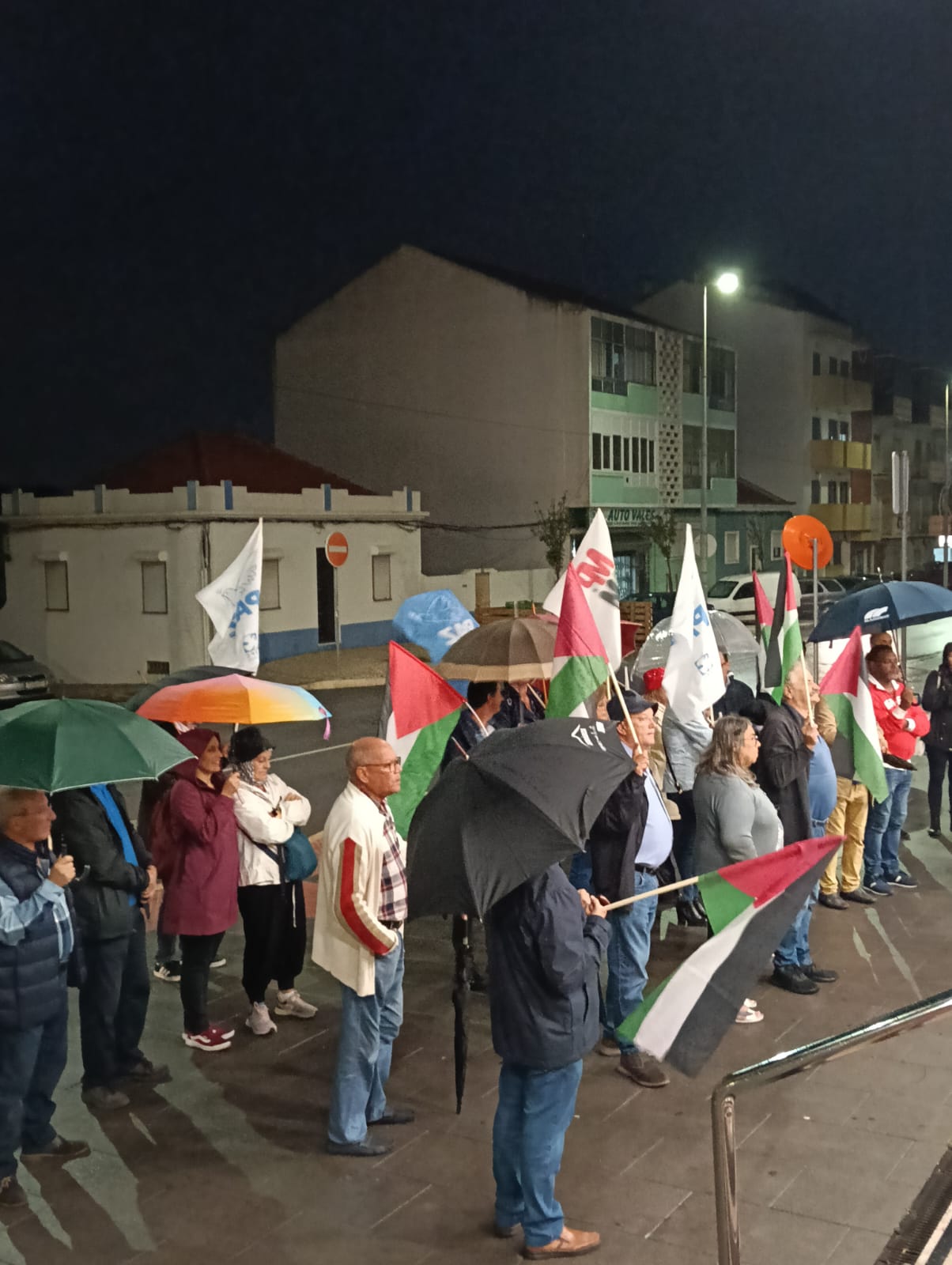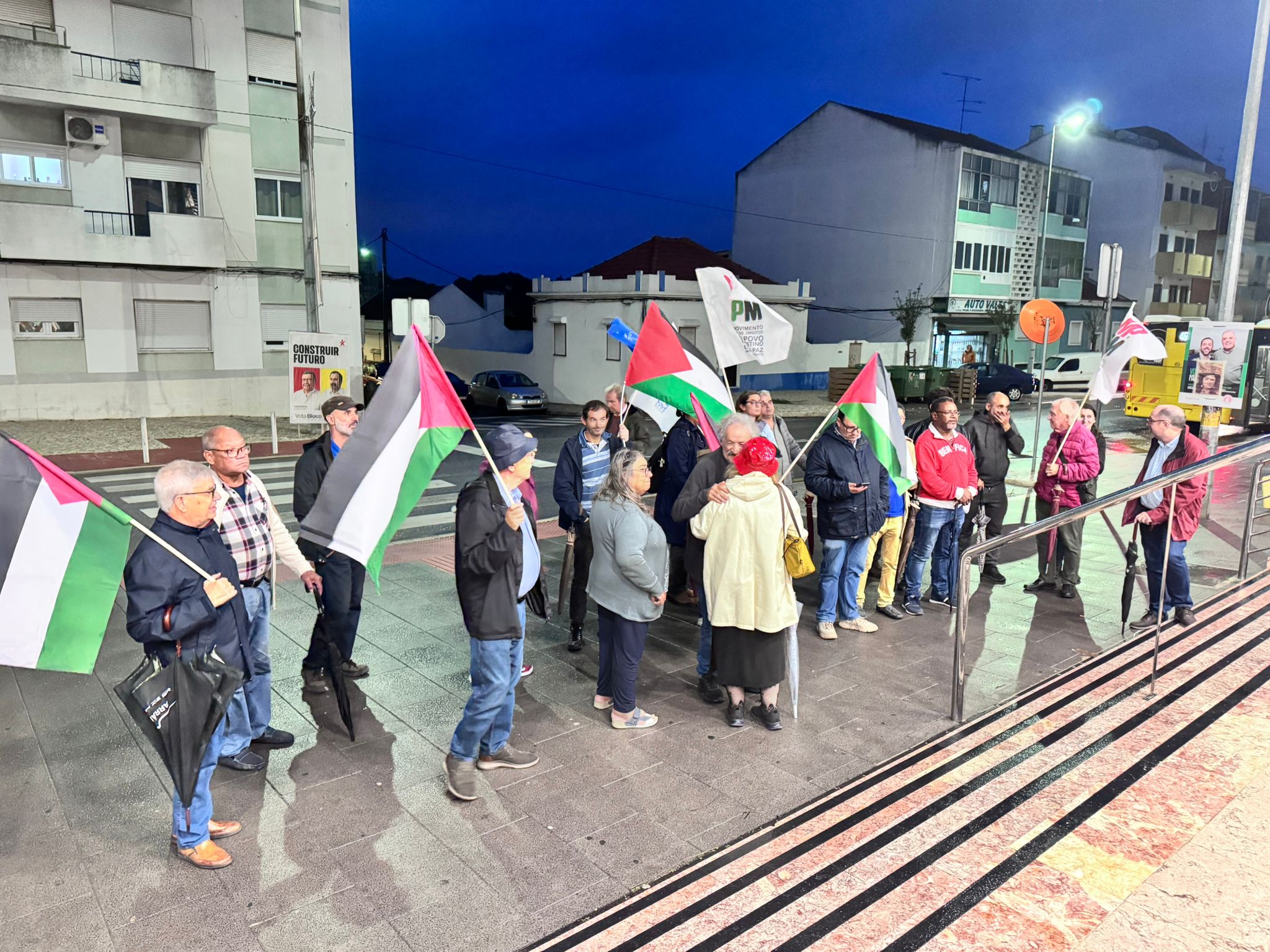 O mau tempo não impediu dezenas de pessoas de se reunir na Baixa da Banheira, junto à estação da CP, na sexta-feira, 31 de Outubro, para manifestar a sua solidariedade com o povo palestino e reclamar o fim do genocídio em Gaza.