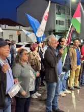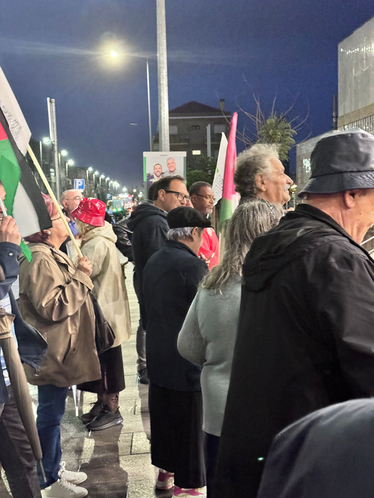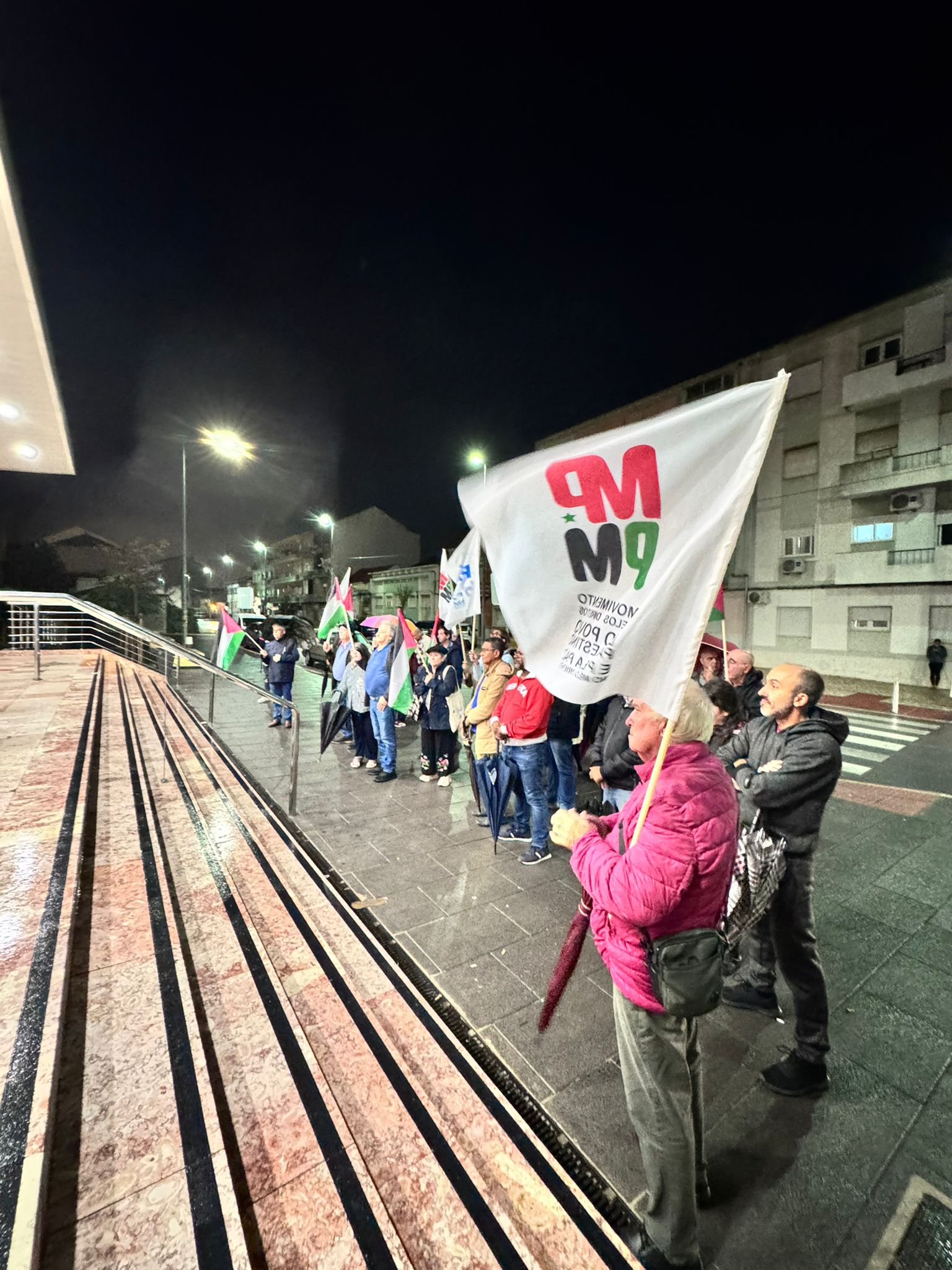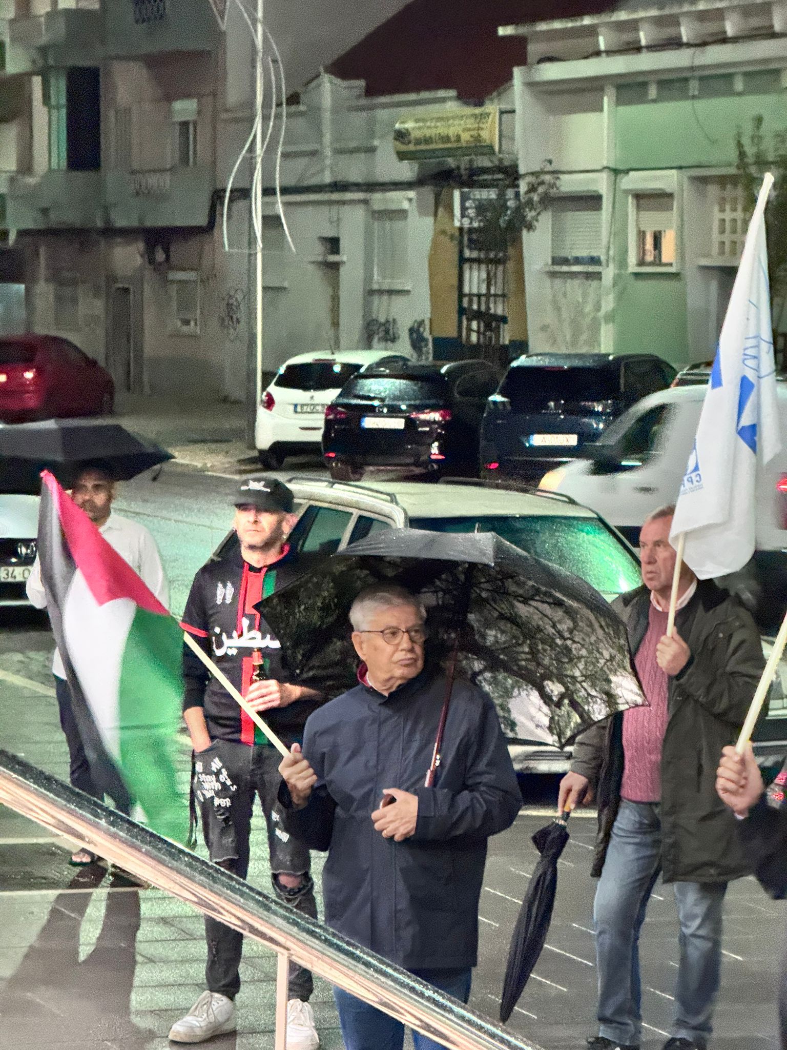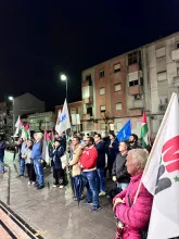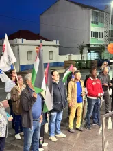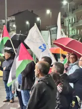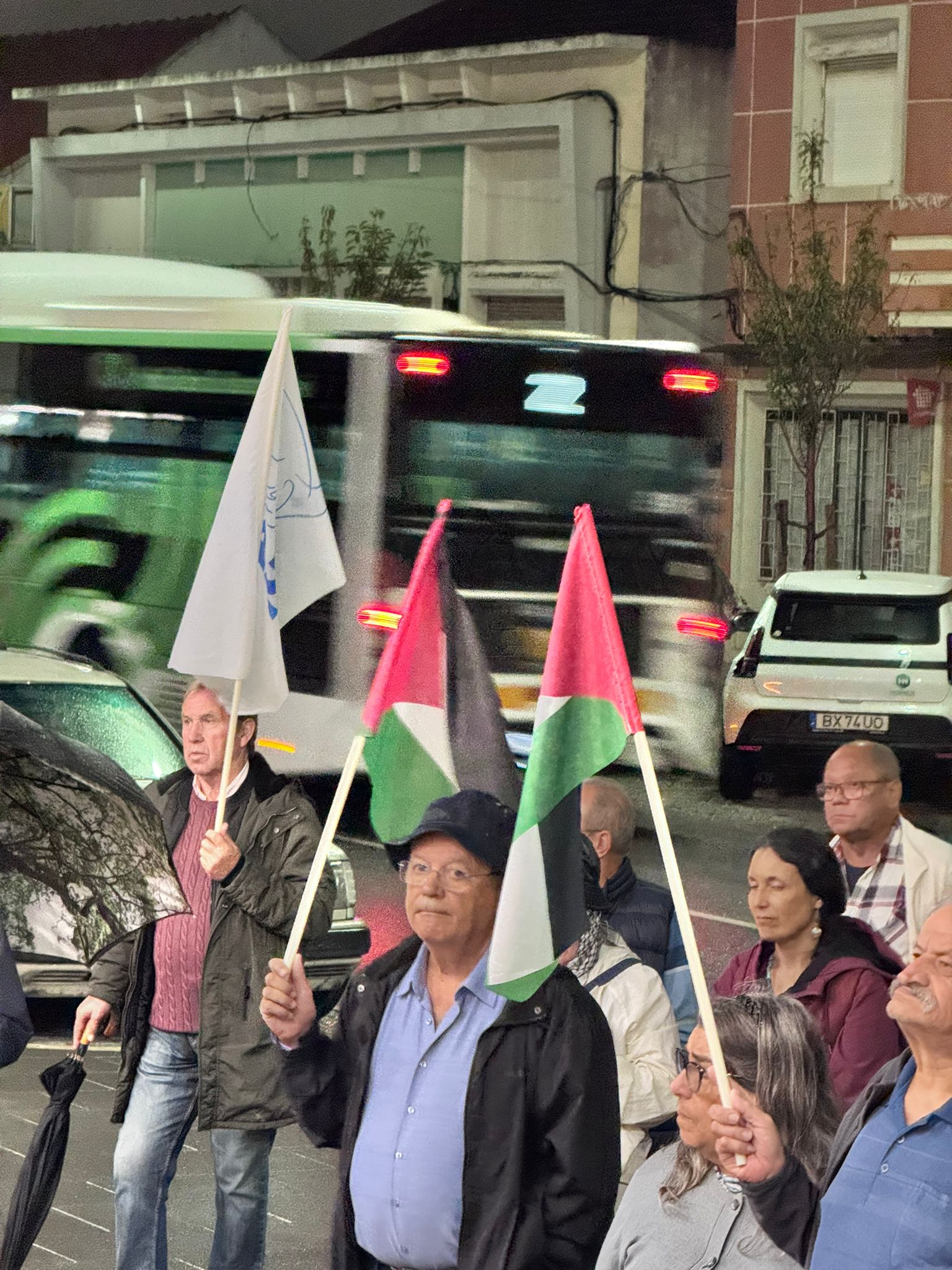 O mau tempo não impediu dezenas de pessoas de se reunir na Baixa da Banheira, junto à estação da CP, na sexta-feira, 31 de Outubro, para manifestar a sua solidariedade com o povo palestino e reclamar o fim do genocídio em Gaza.